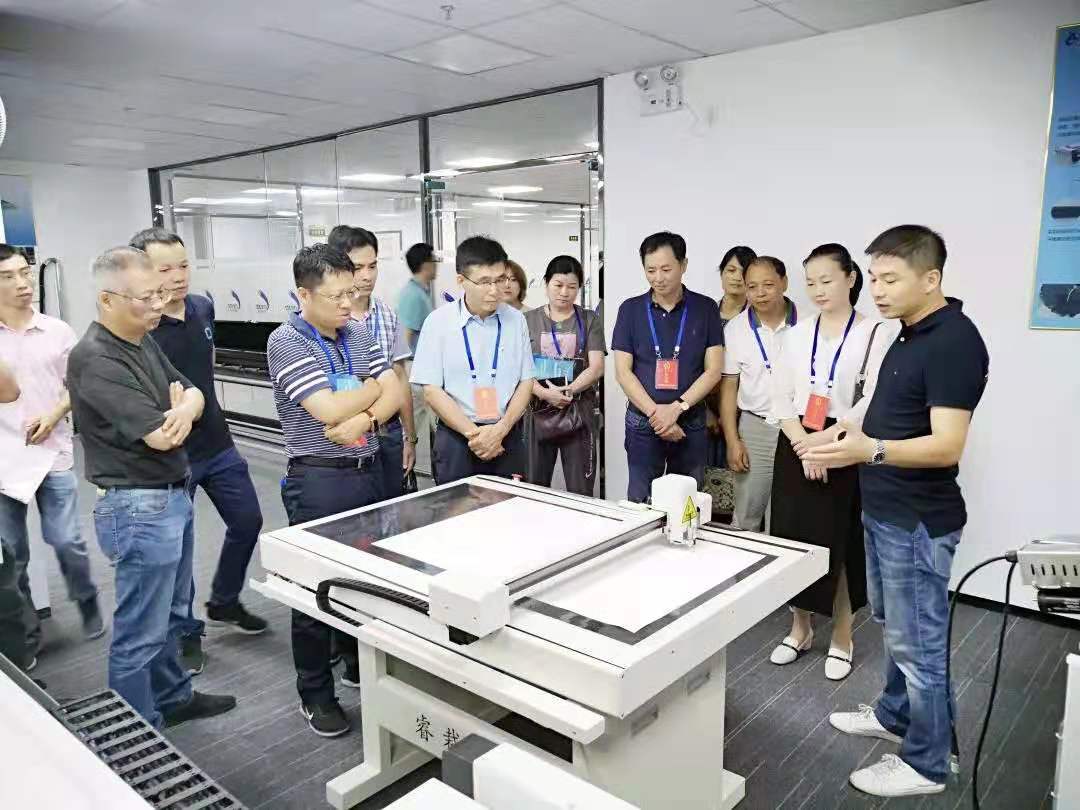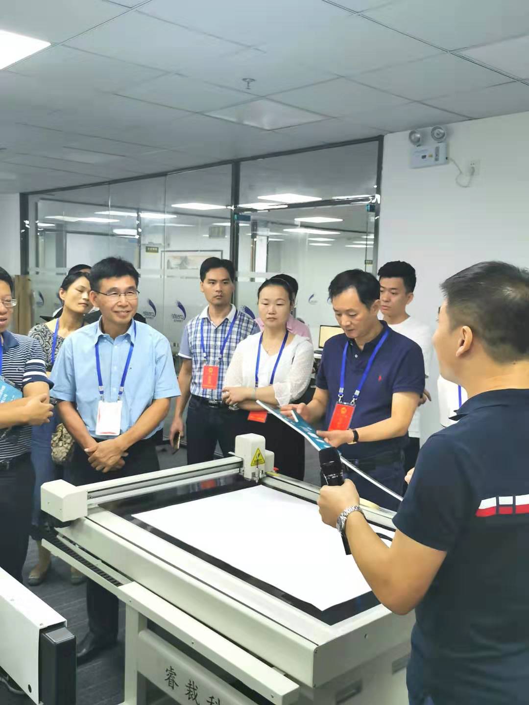 代表们参观了公司研发的电脑切割机系统,该系统不仅拥有先进的计算机辅助设计功能而且具备切割厚、硬材质的能力,又同时拥有快速、准确、低噪音、工序简单和易学等众多优点,填补了国内服装界、制鞋、家私、箱包手袋、纸箱彩盒印刷、激光刀模、灯饰等行业样板自动化设计和生产的一大空白。